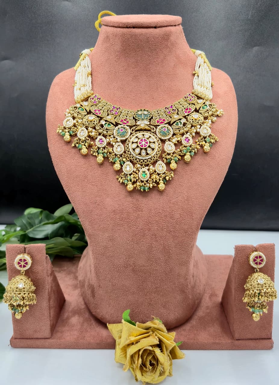 A luxurious traditional style necklace set featuring intricate gold-toned craftsmanship, studded with kundan, pink and green stones, and pearl bead detailing. Paired with matching jhumka earrings, this royal design is perfect for weddings, festive occasions, and classical bridal looks, reflecting timeless Indian heritage and elegance.